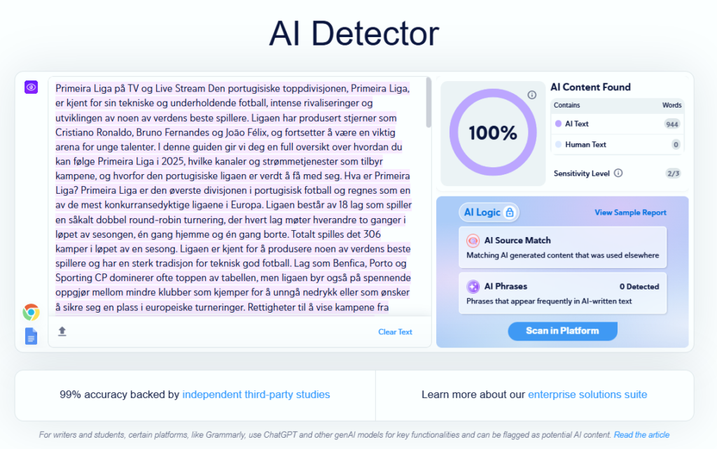 Copyleaks tilbyr flere moduler, inkludert plagiat og AI-indikasjon. På norsk fungerer integrasjonen i noen arbeidsflyter, men presisjonen er ikke på samme nivå som dedikerte norske løsninger i side-ved-side-tester med både bokmål og nynorsk. Vurdering: 6/10 – greit som supplement, svakere som primær kilde for norsk kvalitetssikring.
