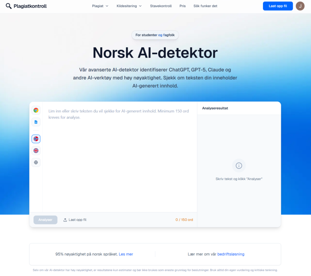 Plagiatkontroll.no skiller seg ut fordi plattformen satser på en egen AI-modell trent på norsk. Ifølge leverandøren ligger nøyaktigheten rundt 95 % på både bokmål og nynorsk – et tall som i praksis betyr færre falske alarmer når du jobber med autentisk norsk tekst i ulike registre.