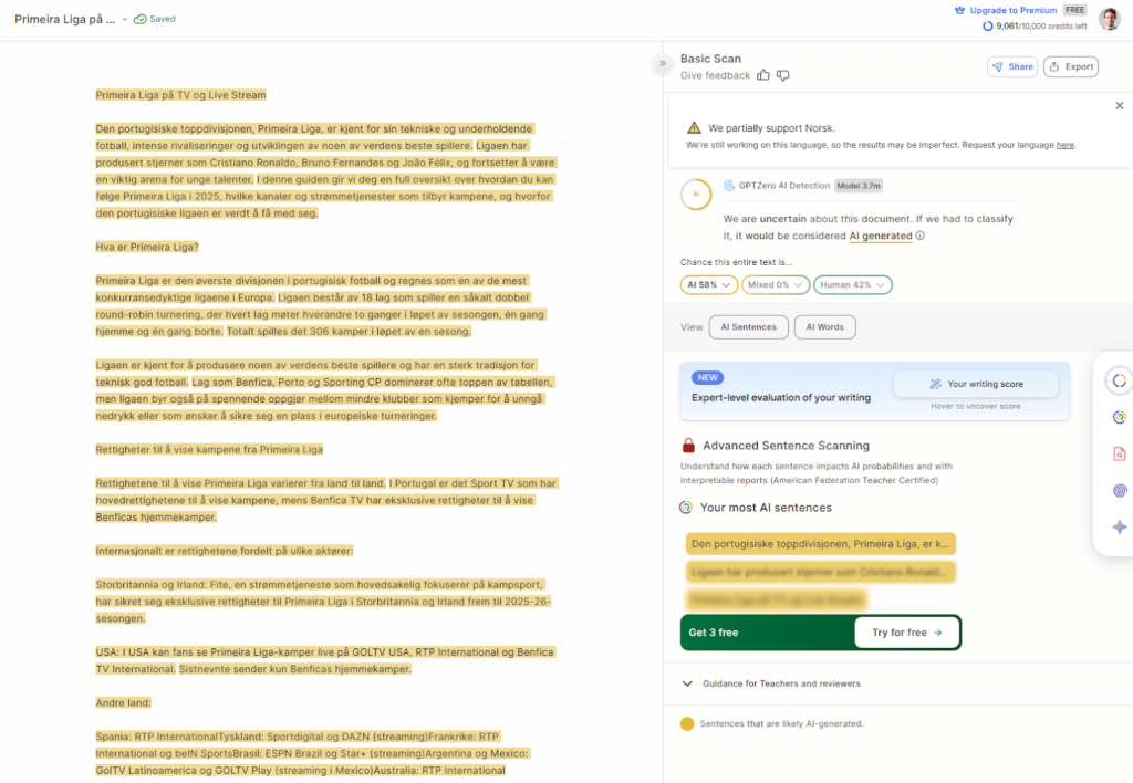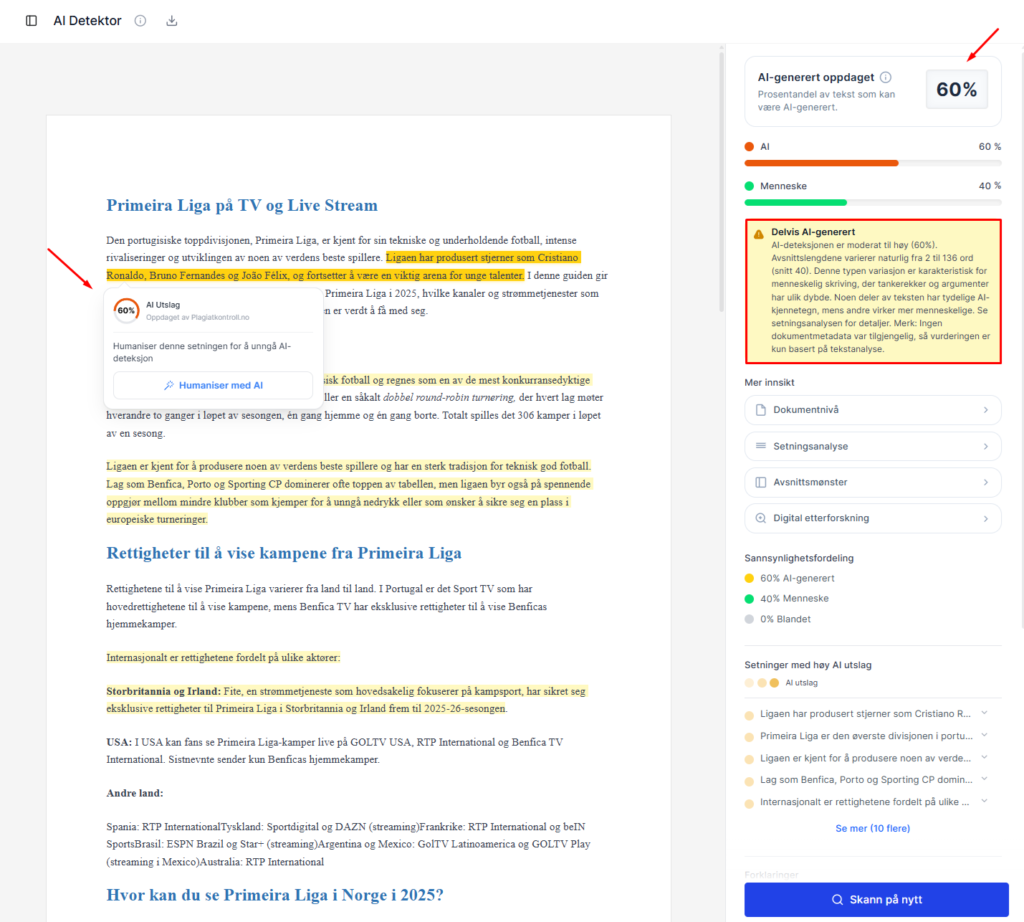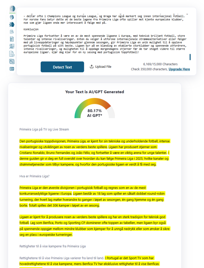 - Se etter falske positiver – Hvis korrekt, idiomatisk norsk ofte merkes som AI, er modellen sannsynligvis ikke kalibrert for språket ditt.